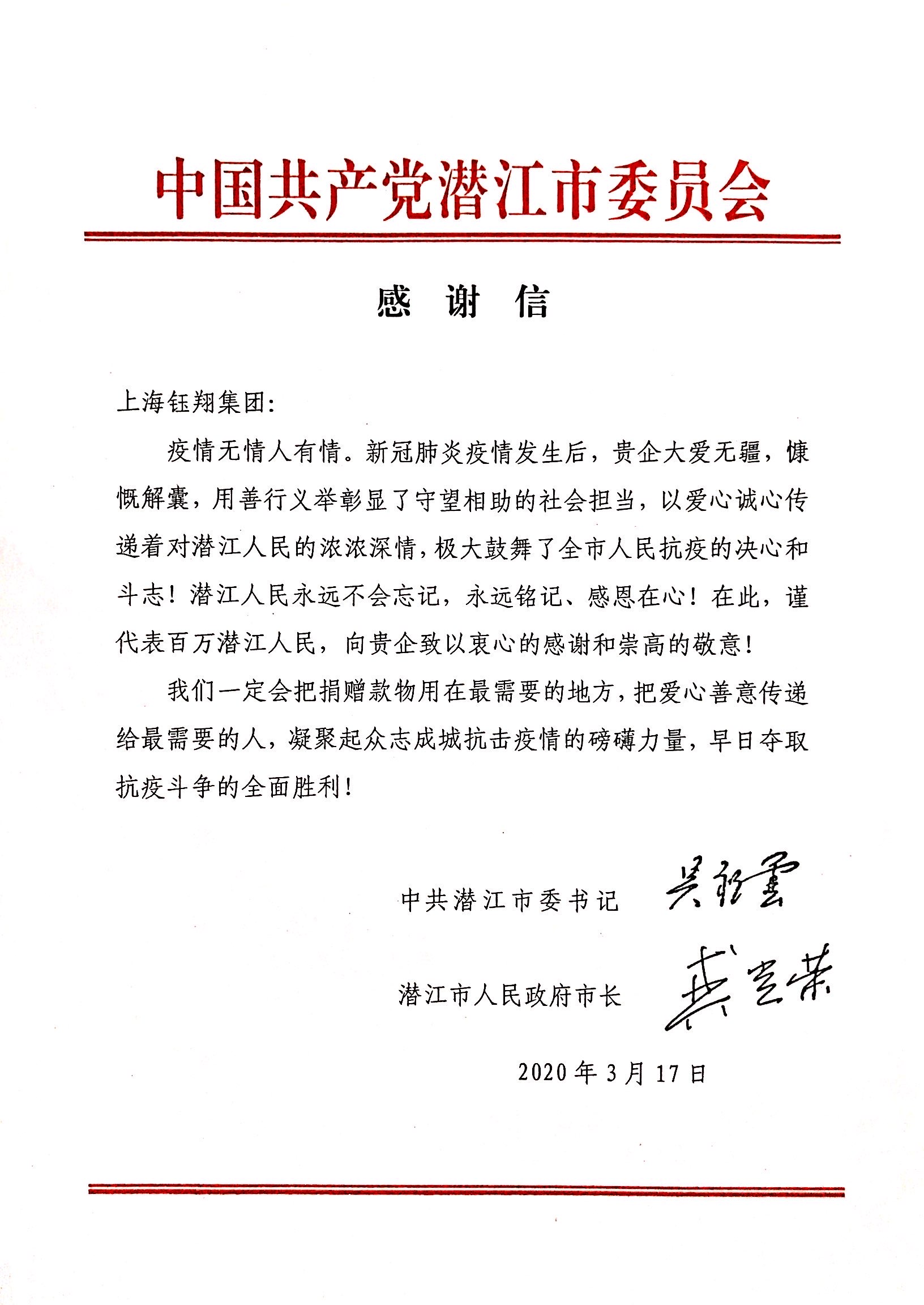 中國共產(chǎn)黨潛江市委員會感謝信